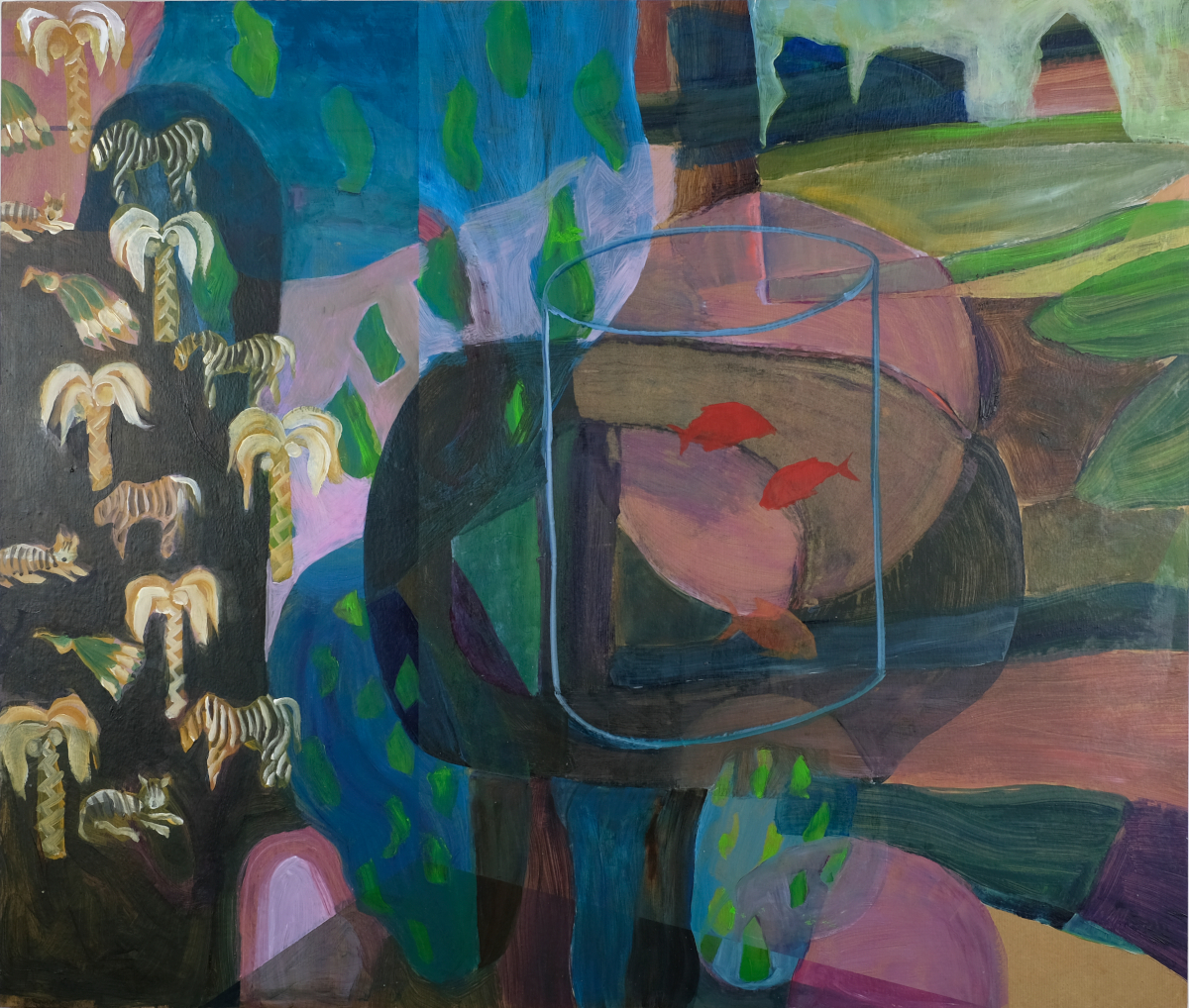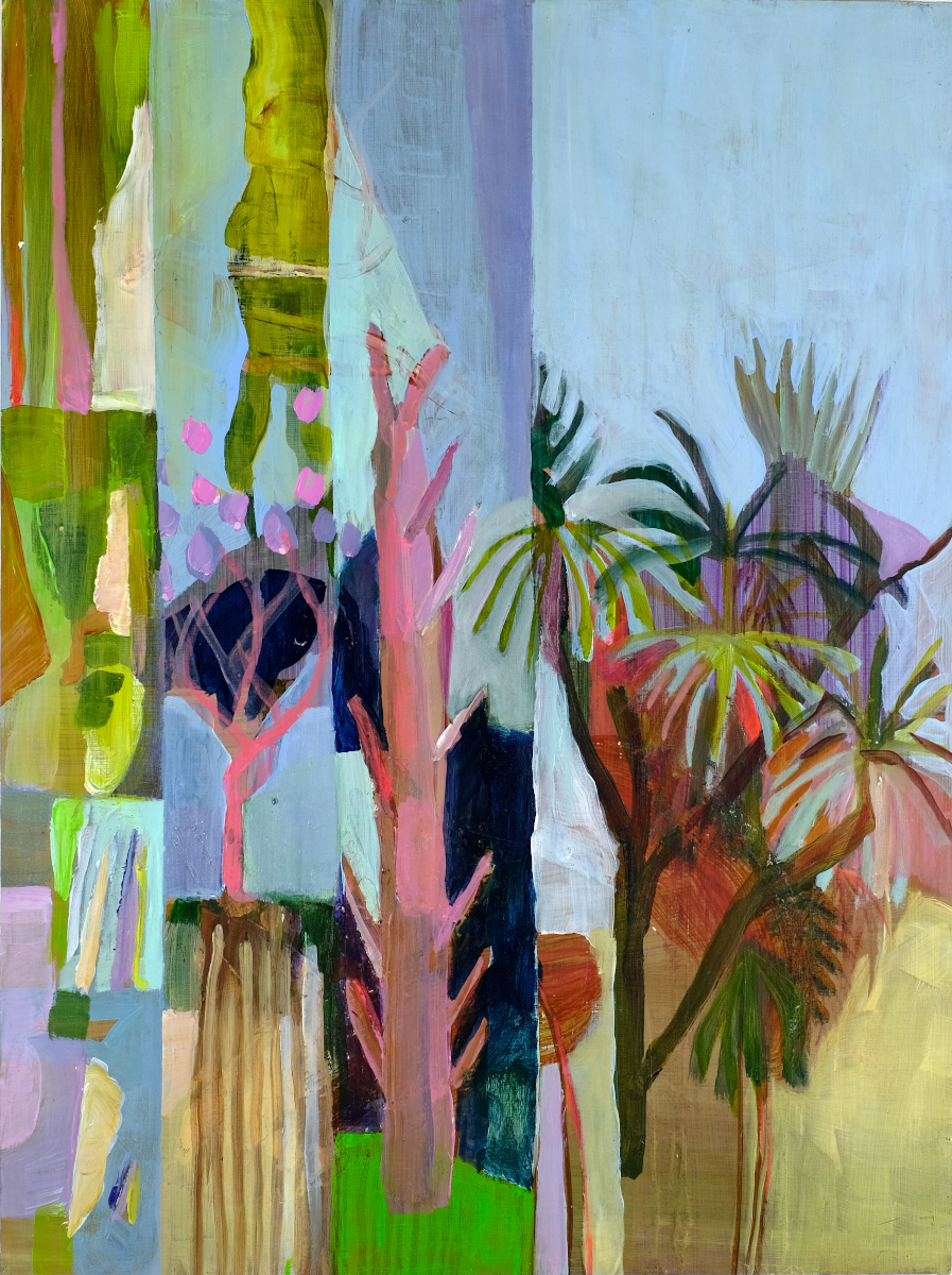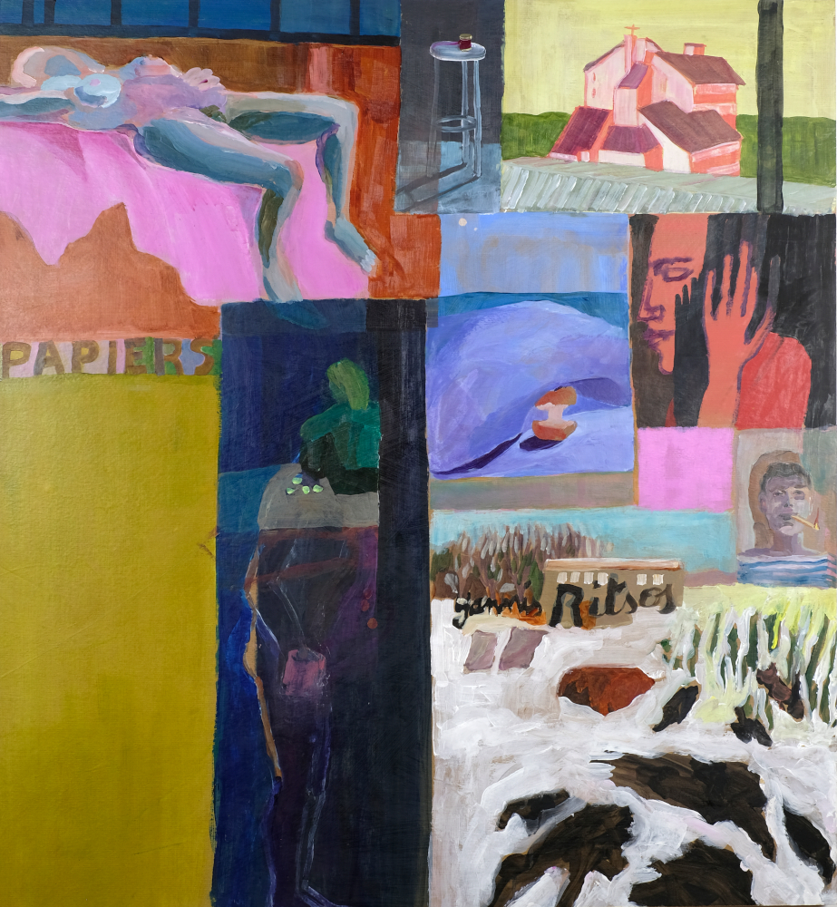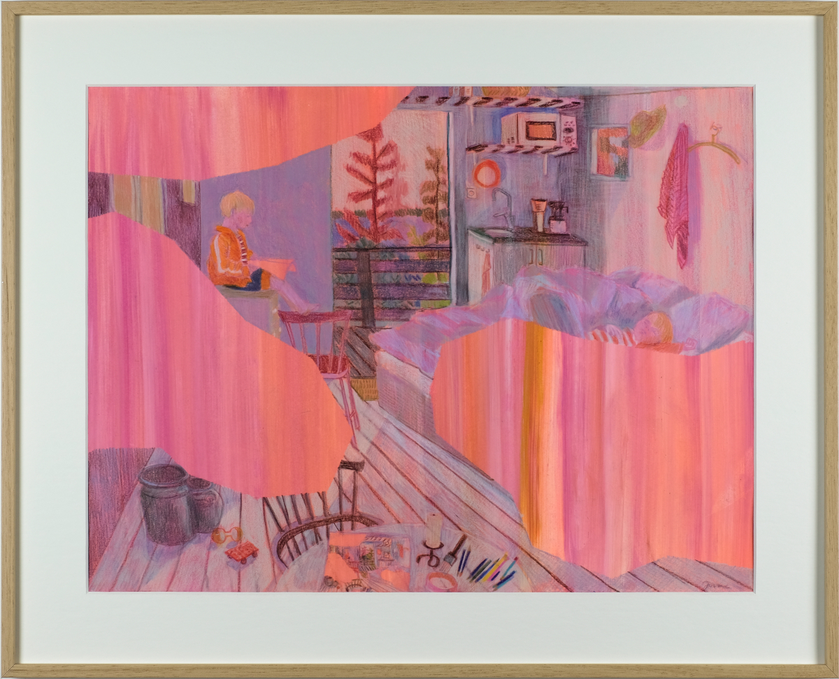 Dans cette histoire, il n’y a pas de méchant, ni de gentil d’ailleurs. Il y a un bateau rouge en plastique, des tapis plus très blancs, quelques éclaboussures et un oiseau mexicain. Le jaune fluo est mélangé au jaune primevère dans l’espoir qu’il dure plus de vingt ans. Vert de source, violet outremer, acrylique sur papier Arches déchiré à la règle comme le veut la coutume. Il y a des arbres aussi et la lueur du soir qui pénètre la fenêtre et illumine les corps. À moins que ce ne soient les corps eux-mêmes qui projettent cette lumière. Les arbres s’allongent jusque dans la baignoire, déplaçant la frontière entre la vision du dehors et celle de l’intime. L’espace joue des verticales, des carrés et des ombres portées. Degas, Bonnard et Diebenkorn se rencontrent dans cette salle de bain de papier qui mesure à peine plus de 11 cm par 15. Il y a des formats plus grands aussi. Des pastels gras dilués à la térébenthine par endroits. Le dessin juxtapose les sensations, la couleur les précise ou au contraire les efface au profit d’une quasi abstraction spatiale. Que reste-t-il quand bébé est lavé, séché, habillé? Que papa a vidé l’eau du bain et maman raccroché le séchoir? Deux trois lignes. Un vide, un plein. Et l’air épaissi dan un coin.