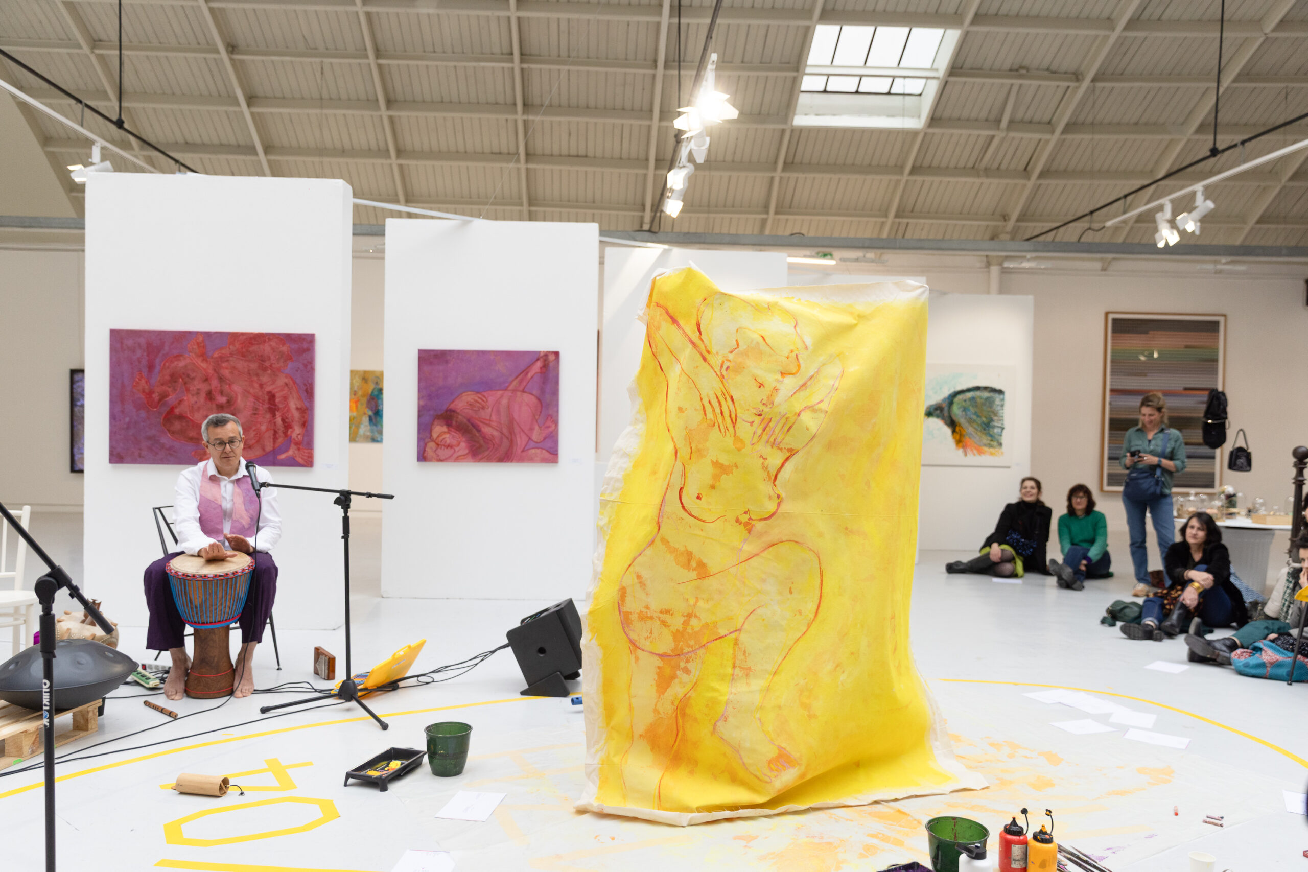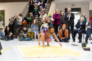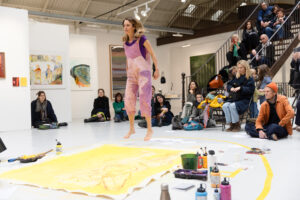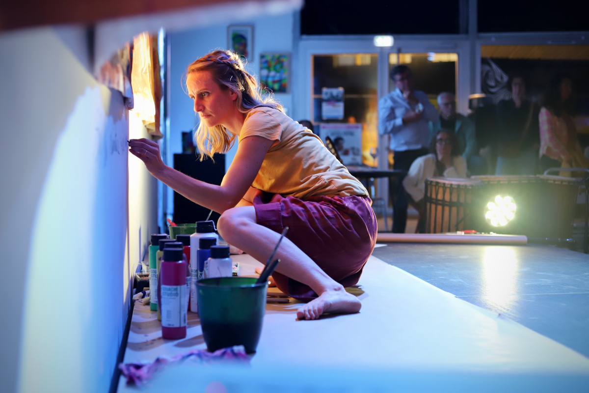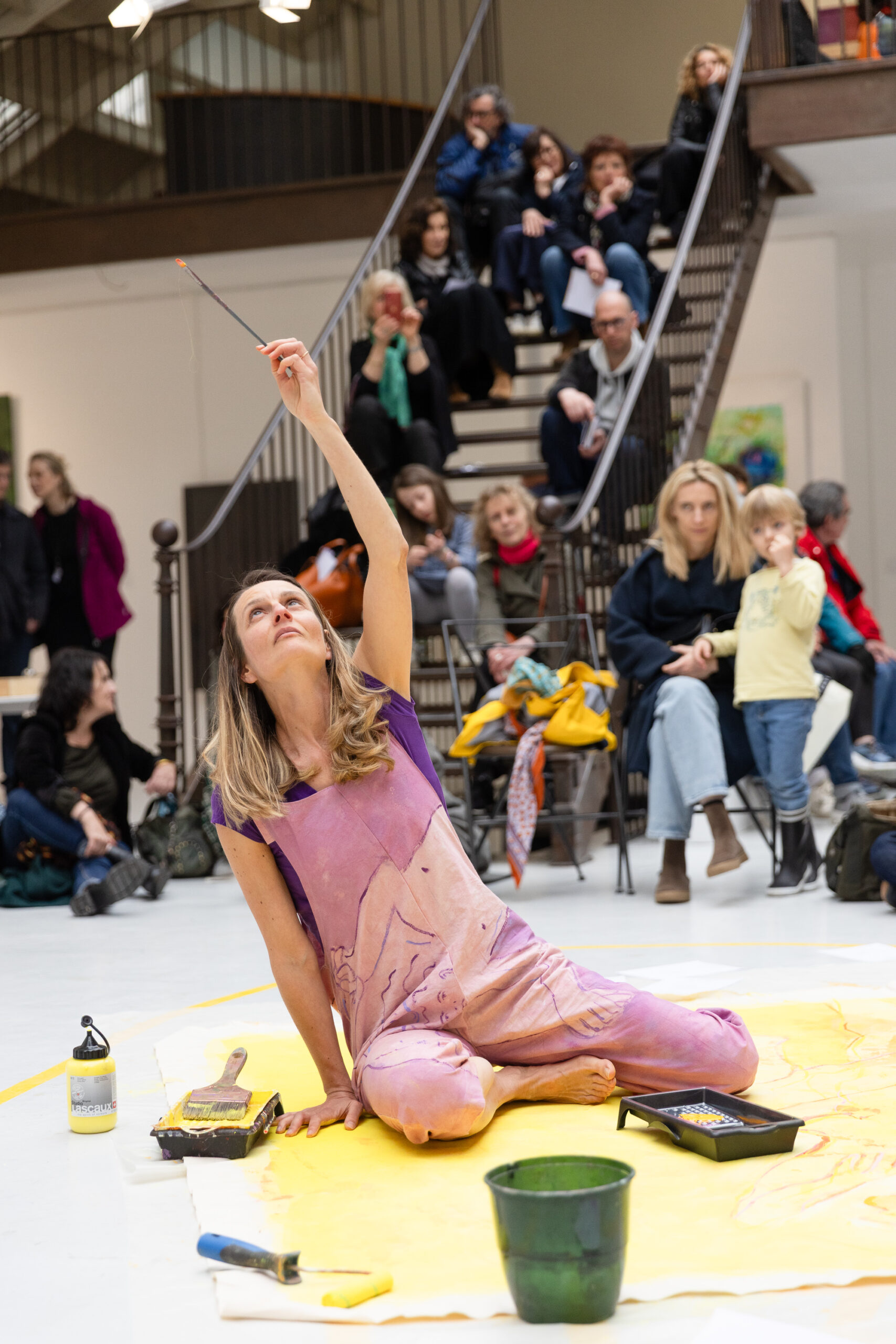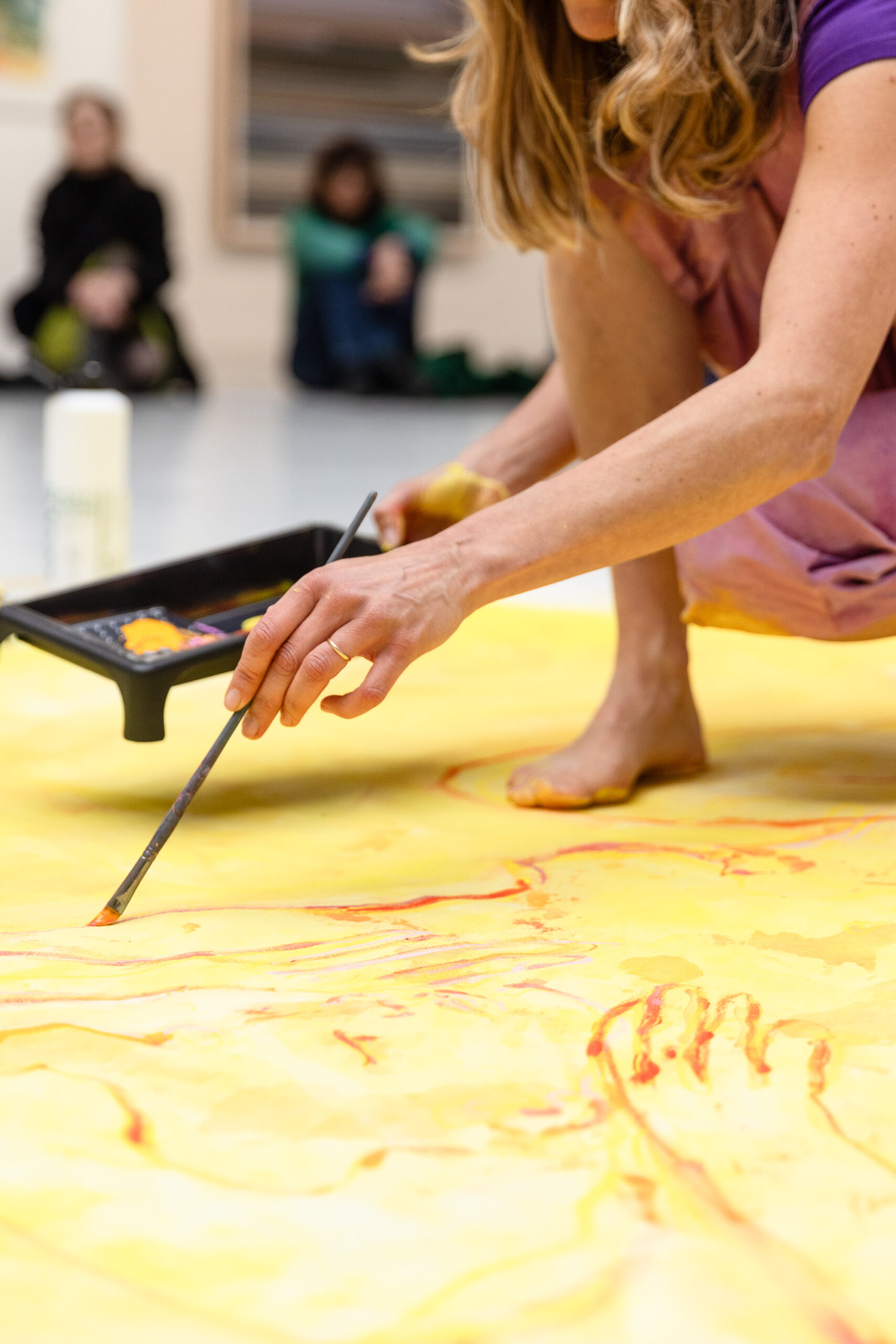 Improvisation son, mouvement et peinture suivant la structure: Unification / Découverte de l’autre / Séparation / Réunification.