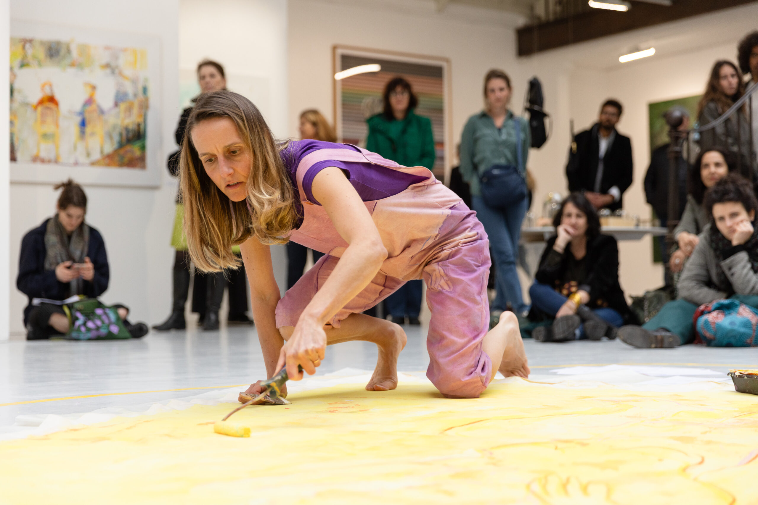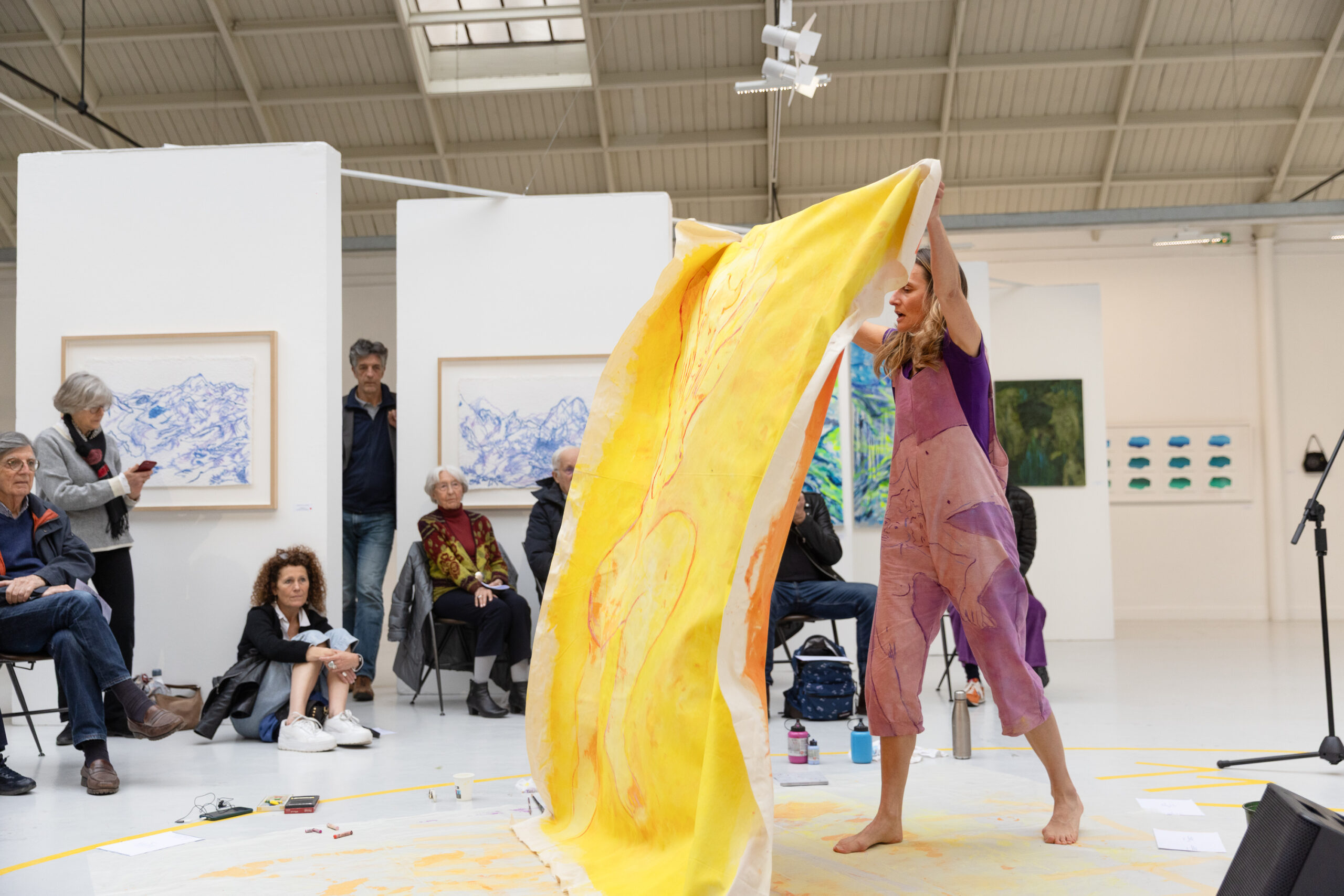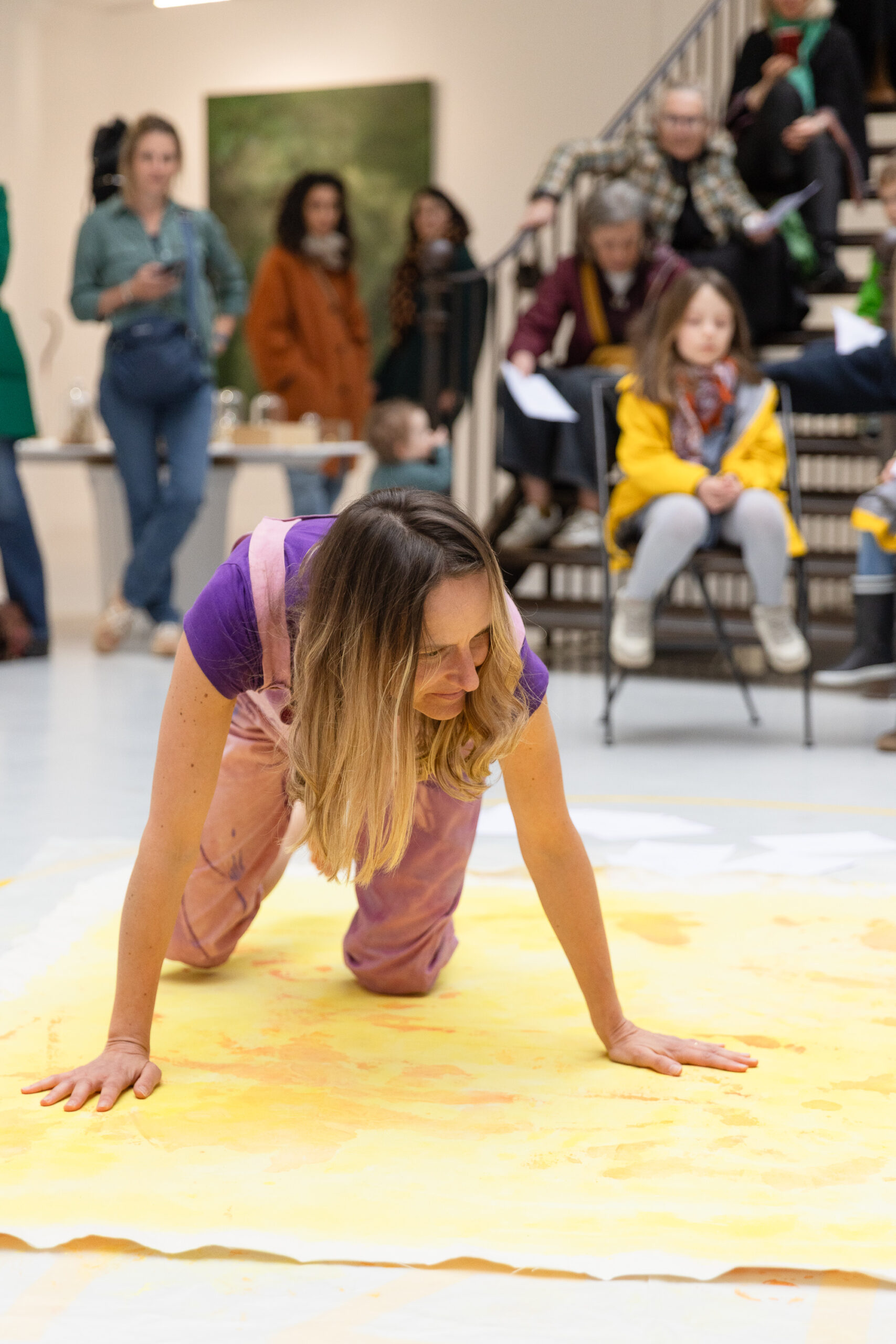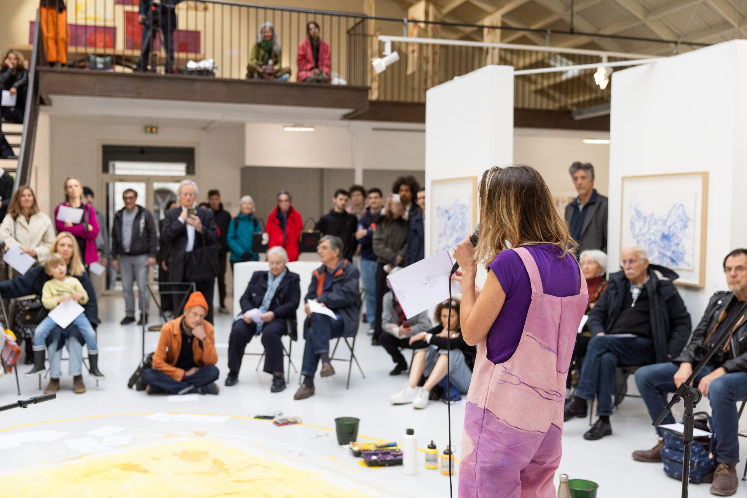 Depuis 2019, dans chaque lieu où elle expose, Juliette June réalise une performance à la fois inédite et récurrente dans sa forme. L’artiste commence par partager un ou deux poèmes écrits de façon concomitante à la création des peintures exposées puis engage l’auditoire à créer avec eux une nouvelle œuvre : après les avoir invités à se tenir debout et poser leur dos contre un grand papier préalablement peint, elle dessine au pastel gras le contour de leur corps qui de fait prend part à un paysage maintenant habité. La performance arrive en écho au travail exposé et ravive l’œuvre en une expérience présente.