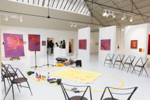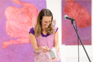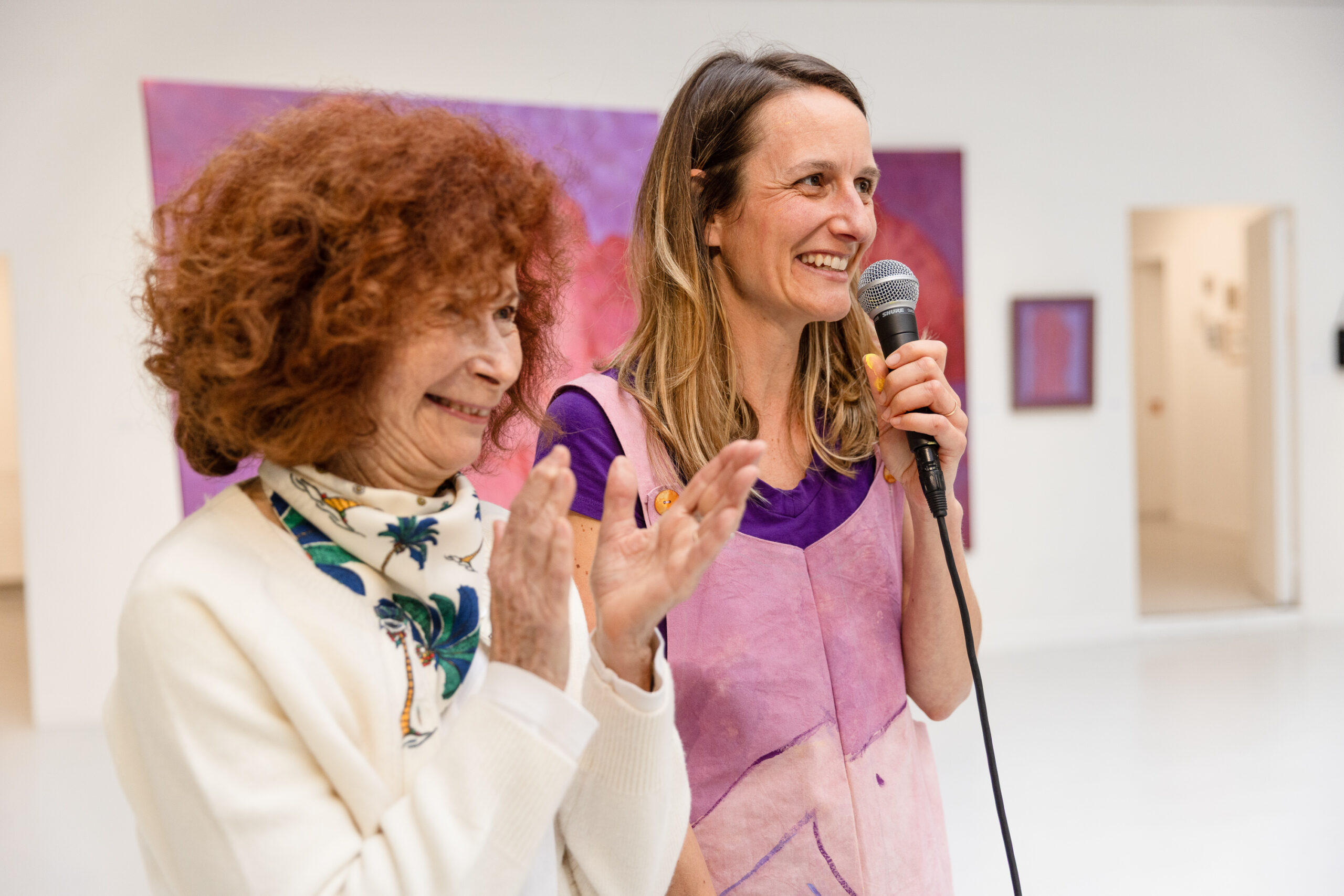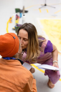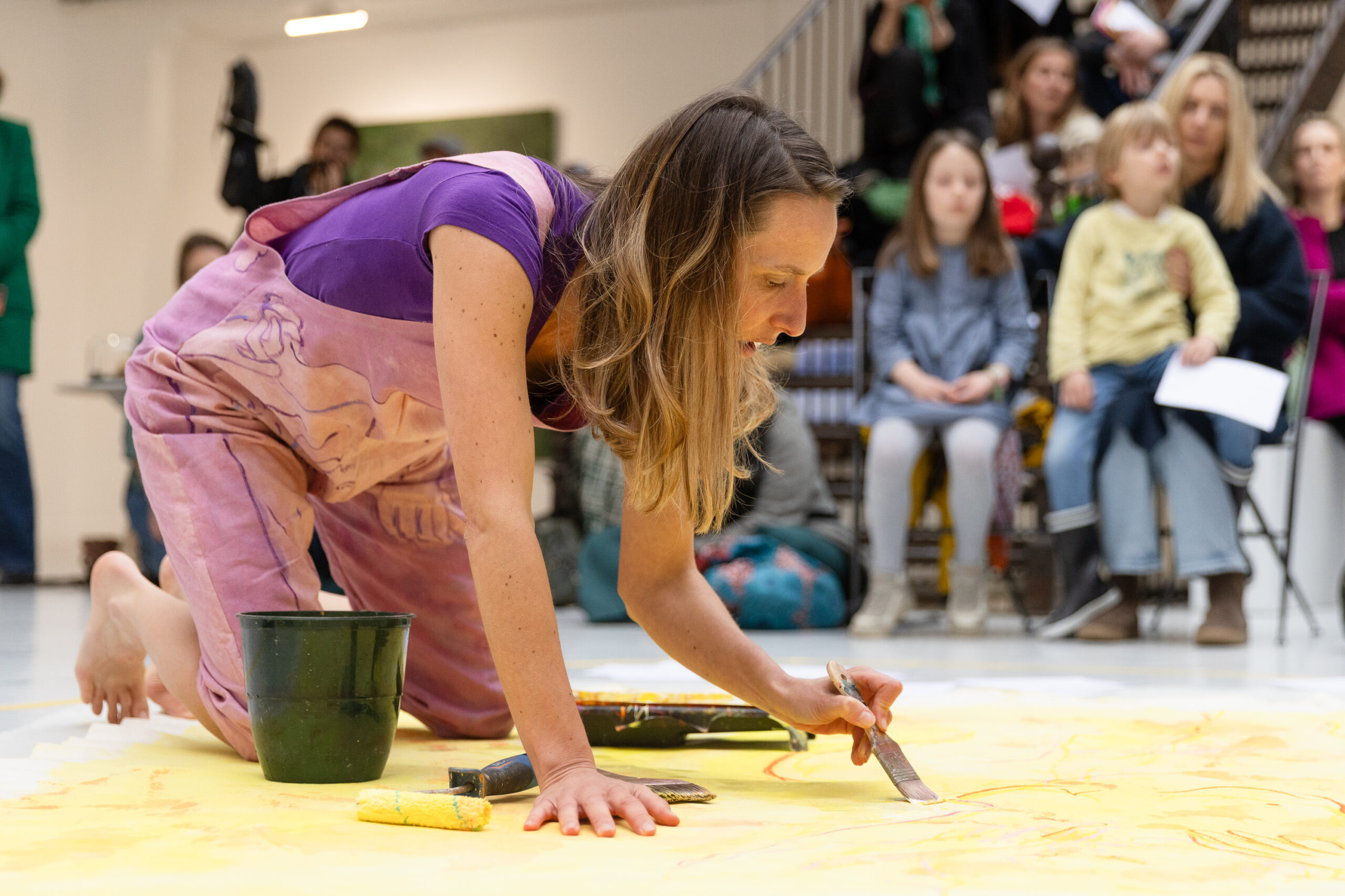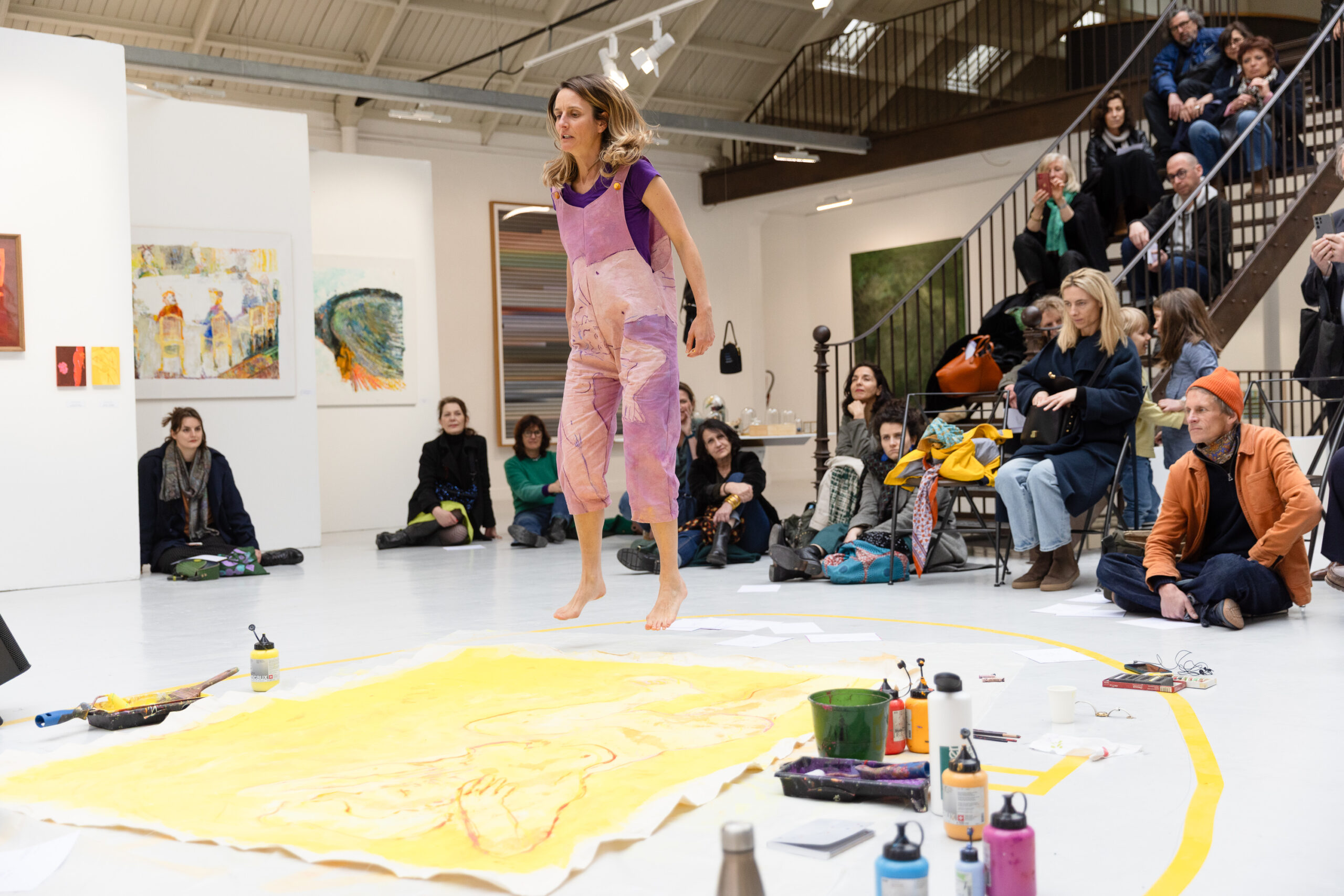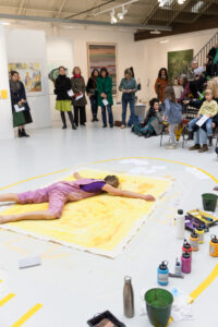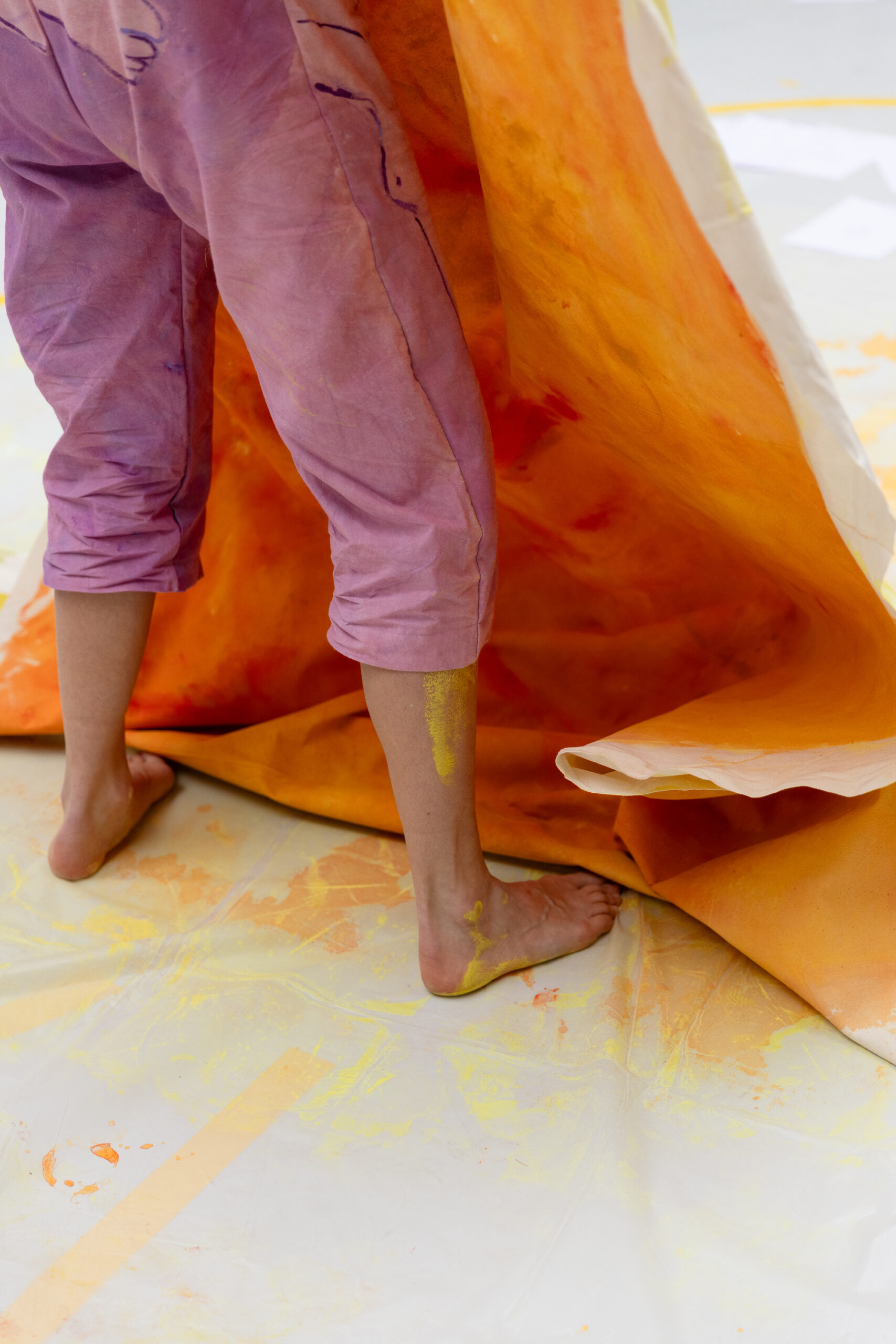 Depuis 2019, dans chaque lieu où elle expose, Juliette June réalise une performance à la fois inédite et récurrente dans sa forme. L’artiste commence par partager un ou deux poèmes écrits de façon concomitante à la création des peintures exposées puis engage l’auditoire à créer avec eux une nouvelle œuvre : après les avoir invités à se tenir debout et poser leur dos contre un grand papier préalablement peint, elle dessine au pastel gras le contour de leur corps qui de fait prend part à un paysage maintenant habité. La performance arrive en écho au travail exposé et ravive l’œuvre en une expérience présente.